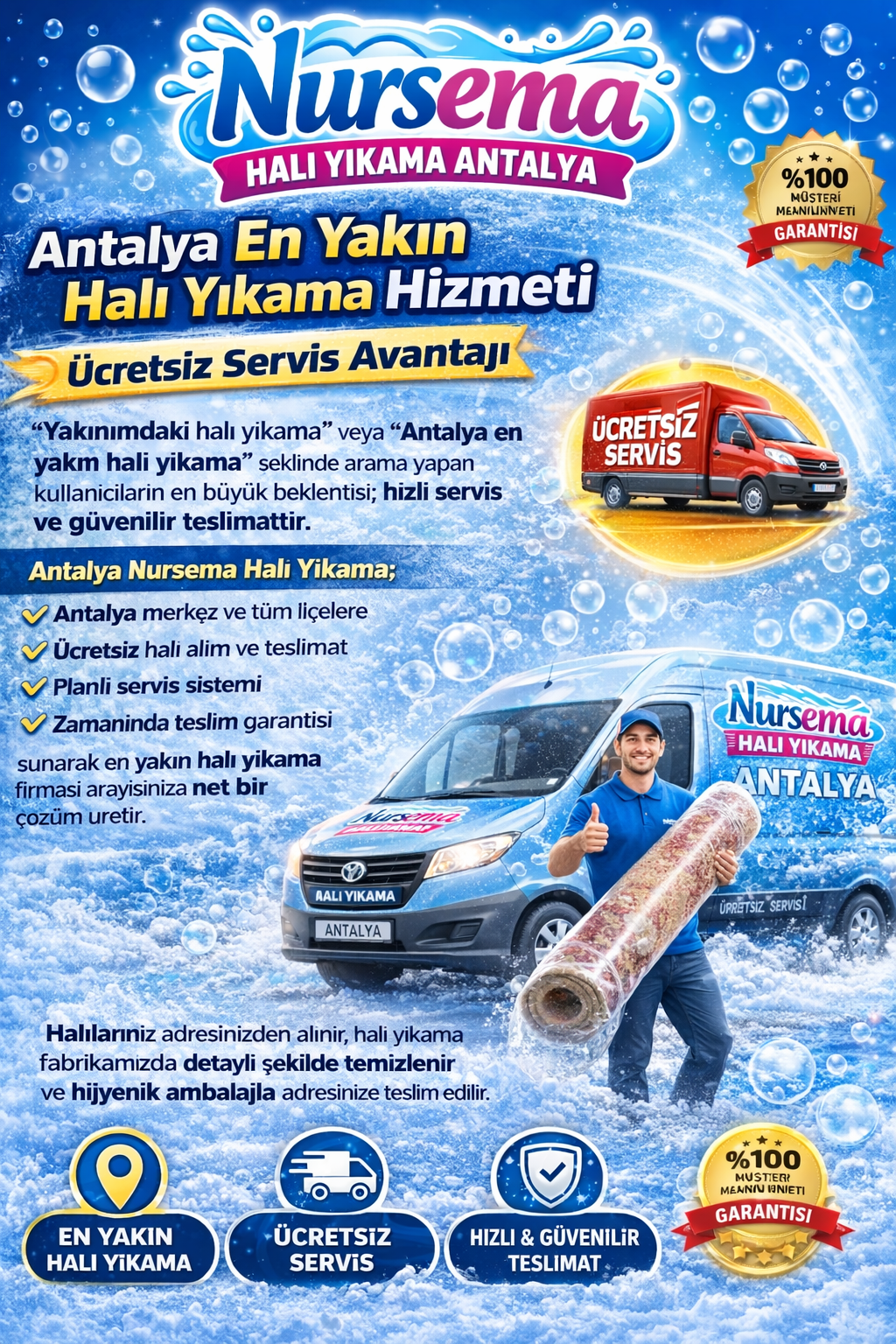 “Yakınımdaki halı yıkama” veya “Antalya en yakın halı yıkama” şeklinde arama yapan kullanıcıların en büyük beklentisi; hızlı servis ve güvenilir teslimattır.